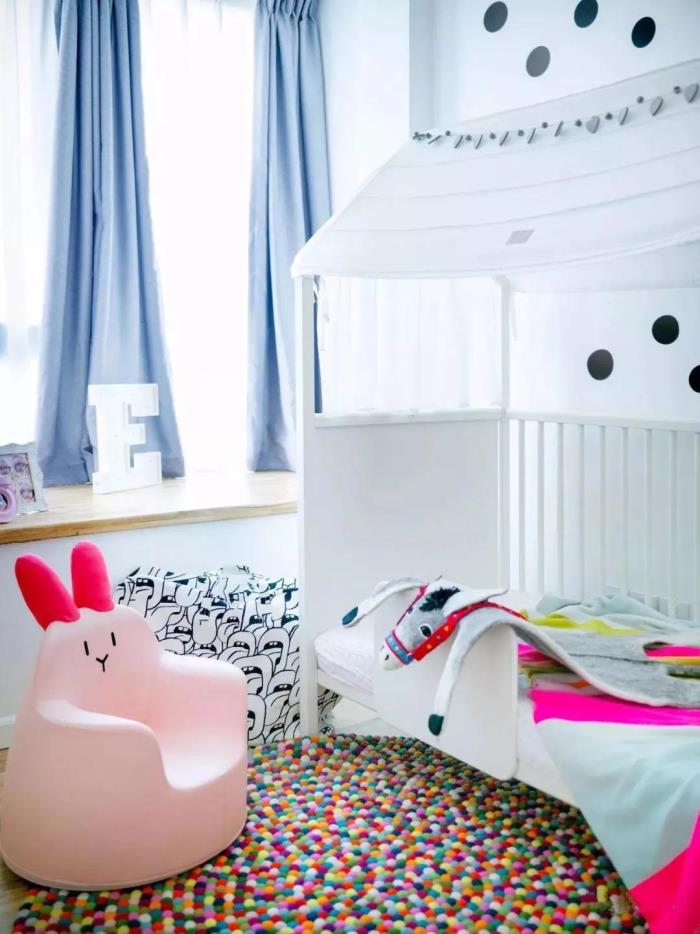 离主卧最近的一间房作为儿童房,Stokke的儿童床,iloom的兔子沙发,彩色地毯和床上的盖毯均来自HAY。