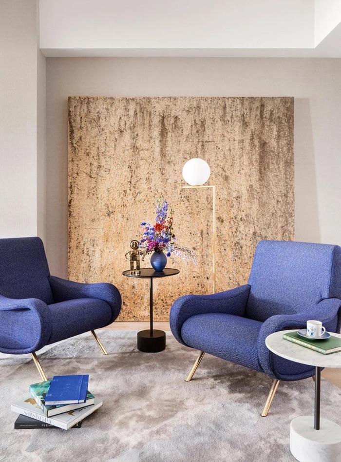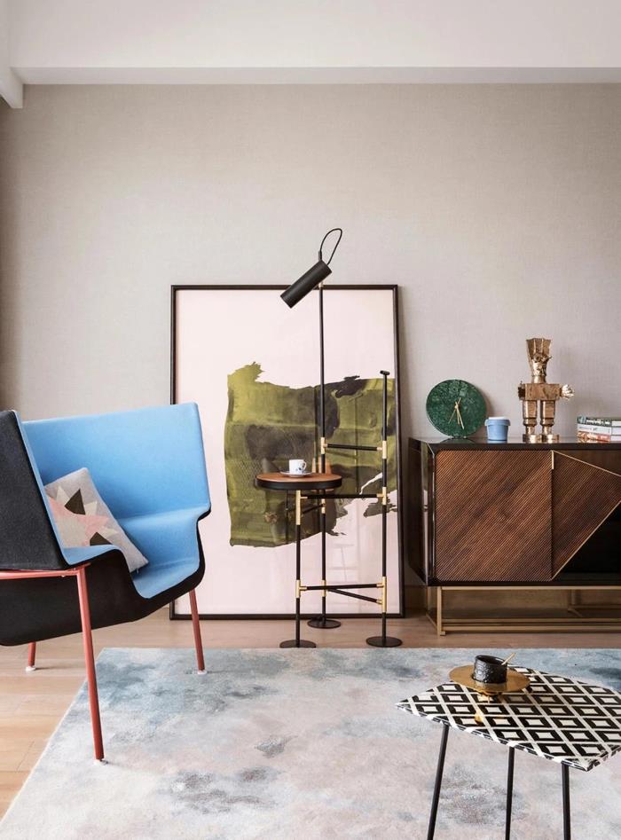 靠墙的大幅画作是法国艺术家Clément Borderie的作品,蓝色扶手椅来自Cassina大师系列的经典lady女士椅,由意大利设计师Marco Zanuso设计。落地灯为英国设计师Michael Anastassiades为Flos设计的IC LIGHTS F2。