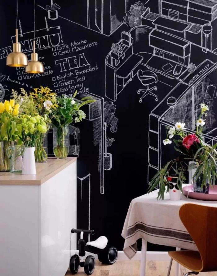 她说当朋友来家里做客时,可以像咖啡馆一样,黑板上写上可供应的咖啡、茶的种类。等孩子大了之后,这块黑板还能满足女儿涂鸦的乐趣。