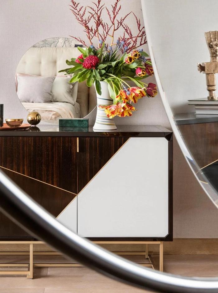 设计师打造了一面具有3D视觉效果的波浪板背景墙。灰色Sorrento沙发,来自于全球排名前10的奢华家居品牌Baxter。搭配意大利国宝级玻璃品牌Glas Italia的圆形边桌,花器来自于minimaïst。