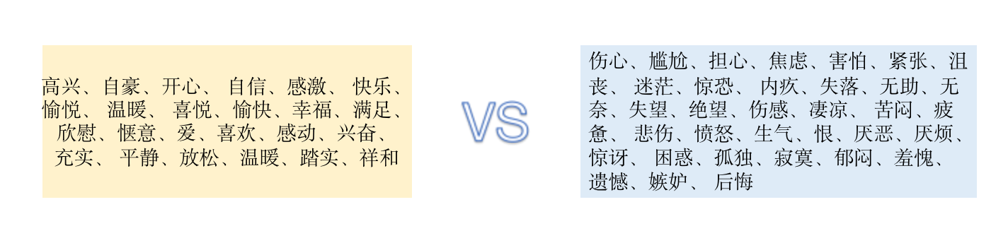 下图提供了两大类形容词供大家参考,你可以仔细观察自己的感受,然后尝试用更精确的词语描述那一刻的情绪。