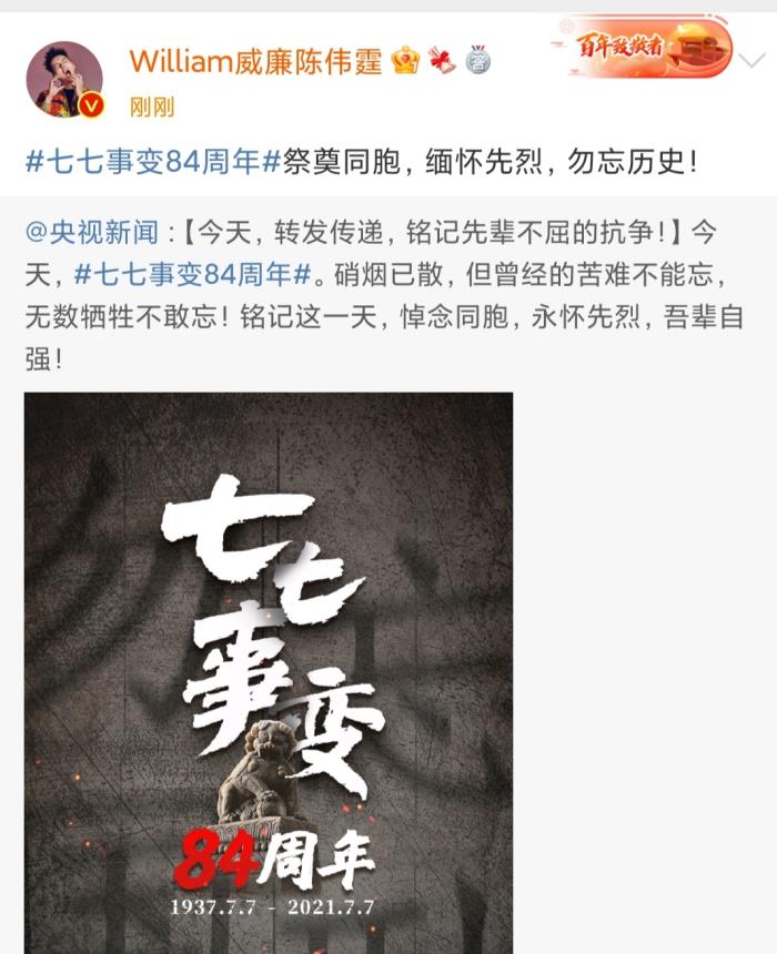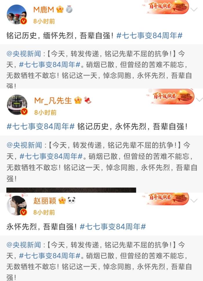 当然,我们也有不少港澳台的明星也转发了文章,用他们力所能及的力量来影响更多的人,来警鸣长钟,纪念先烈,他们都是中国的代表,希望先烈们可以看到我们都知道他们的付出是有回报的,这些经历也都会也永远警醒着我们前进,成为永远在前进的国家。