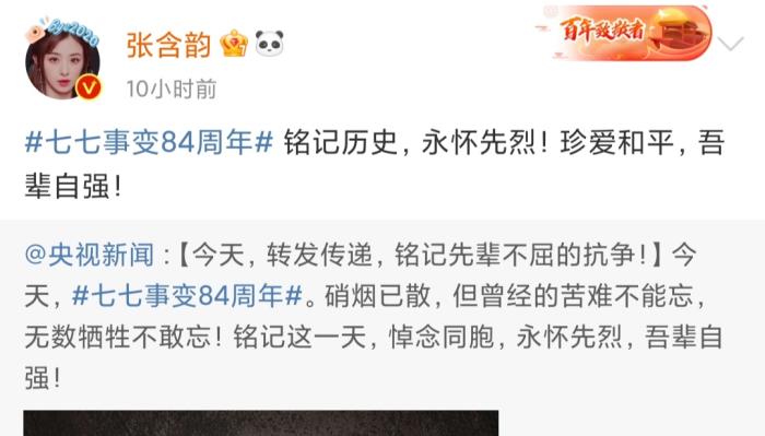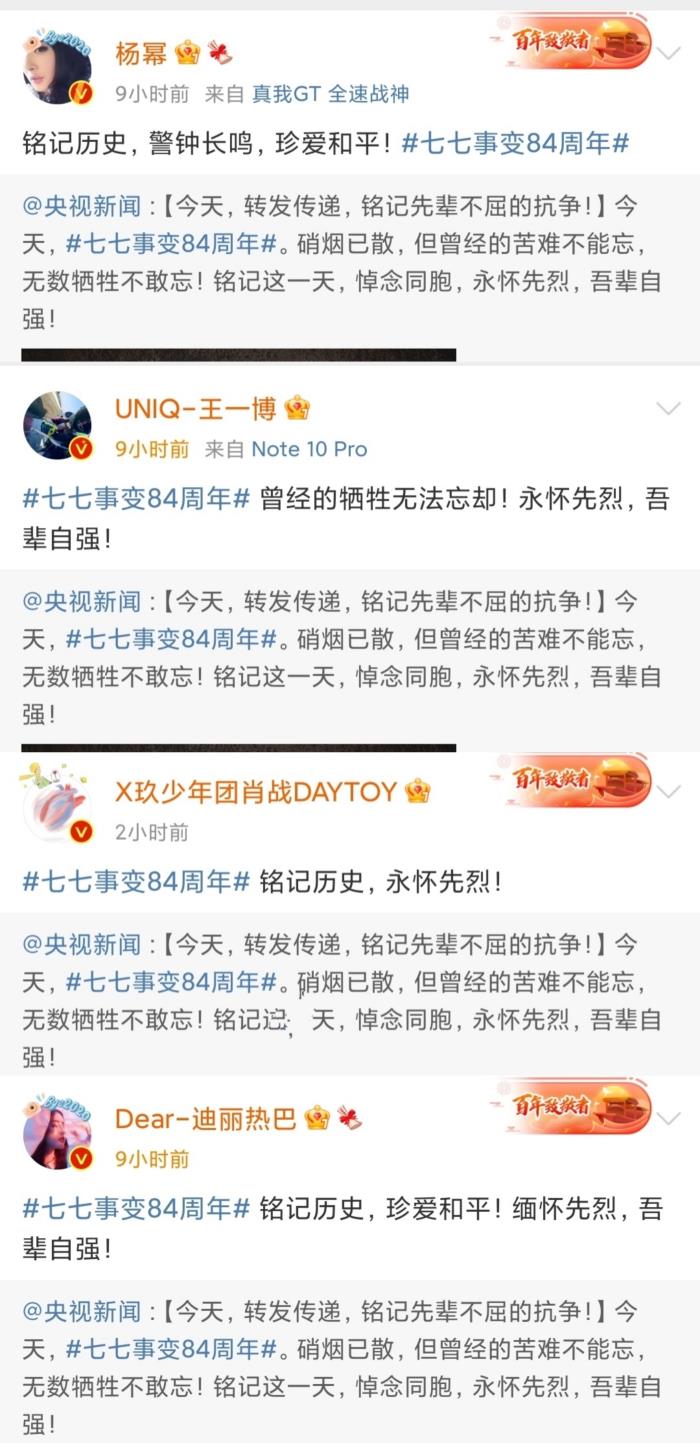 其实无论是老一辈还是年轻一代,每年都会发文纪念七七事变,目的就是为了提醒人们要铭记历史,吾辈当自强,知道当今生活的来之不易。我们也应该为这样的爱豆点赞。