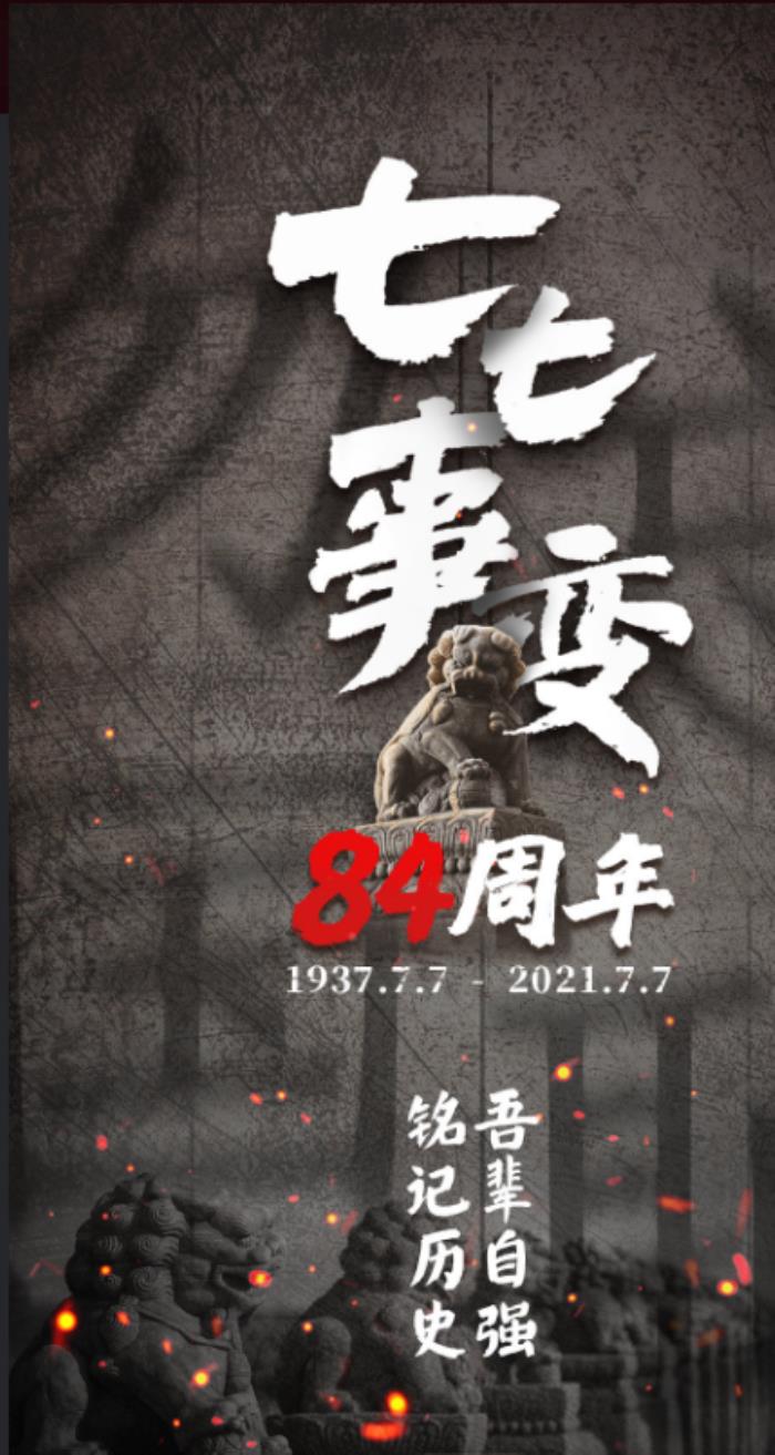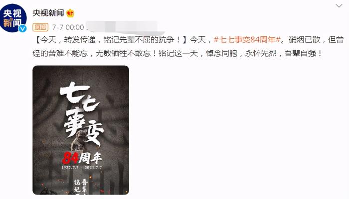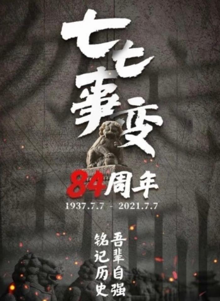 7月7日,是我国七七事变的84周年。今日零点整,由央视新闻在社交软件上发出一张七七事变的宣传图,图中可以清楚的看到七七事变84周年,并标注了七七事变的时间,下面还标注了"铭记历史,吾辈自强"八个字!并配文道,硝烟已散,但历史要永远铭记在心,要永怀先驱,吾辈当自强!由此来祭奠先辈们不屈的抗争和勇敢的牺牲!因此,我们当永远珍爱和平,牢记使命,缅怀同胞!