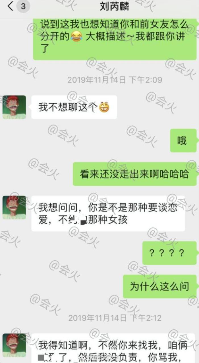 刘芮麟甚至给女粉丝发露点表情包,自夸这是骚表情,并称赞你的胸也不差。