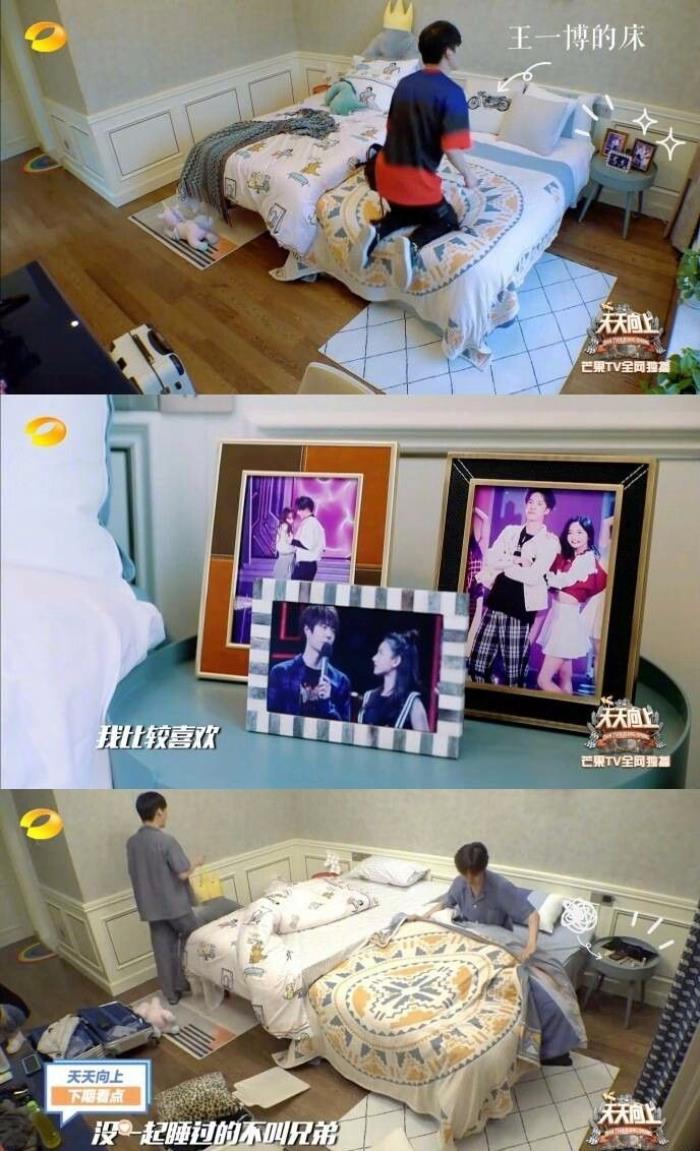 最近一期《天天向上》中,四兄弟出去度假,节目组不仅贴心的为天天兄弟准备了房间,还特别有心的在王一博的床头放了三组和漂亮小姐姐们的合影,分别是王一博和程潇、宋祖儿、周洁琼的同框照。可见,节目组为了自家主持人的终身大事操碎了心,但是没想到,下一秒,王一博就将照片全部倒扣了!