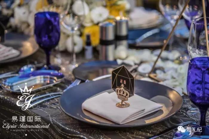 晚宴的桌签,则用的是金色皇冠桌签夹和黑金钻石形名签,搭配黑色餐盘和白色餐巾,质感相当高级。