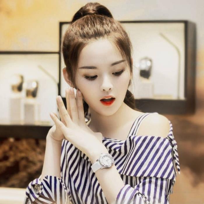 蓝白条纹的露肩装,非常清新文艺,一侧带有肩带的斜肩设计,个性十足。扎着高马尾辫,点缀樱桃红唇,完美的脸型与满脸的胶原蛋白组合一起越看越耐看。