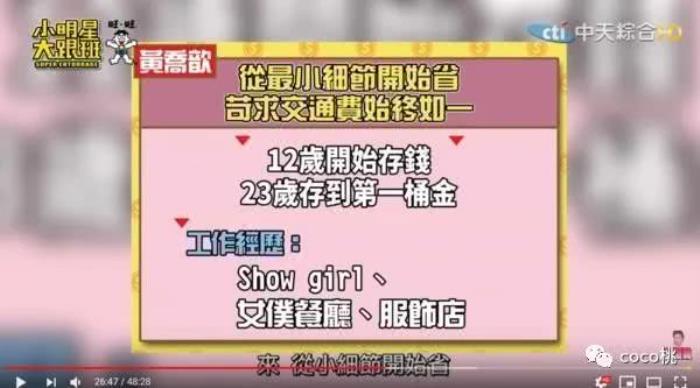 出道后更是坚持靠大众交通工具通勤,也从不去夜店玩。一集通告只有3600新台币的她,在23岁的时候,存下了100万台币。