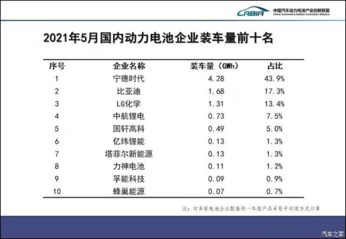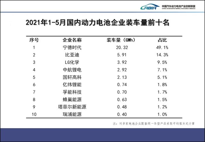 值得关注的是,相较之下,根据国内动力电池装车量最新数据显示,过去一直高居榜首、在国内动力电池市场占据过半份额的宁德时代,在2021年1~5月却跌破50%市场占有率大关,具体为49.1%。而且下降的情况或有越来越大的趋势。在2021年1~5月,宁德时代在国内动力电池总装车量中占比依次为53.1%、55.1%、50.2%、45.5%、43.9%。而国内市占率仅次于宁德时代,同时将宁德时代视为最大竞争对手(对宁德时代占据市场龙头地位很是不服气)的比亚迪,2021年前五个月在国内动力电池总装车量中占比却在上升,具体依次为13.0%、13.3%、12.5%、14.6%、17.3%。事实上,对于宁德时代来说,除了比亚迪外,LG化学、中航锂电和国轩高科等厂商也都不可小觑。