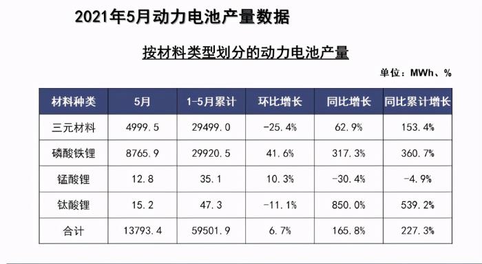 磷酸铁锂电池在时隔三年之后,首次实现对三元锂电池的反超。最新数据显示,今年5月,国内动力电池产量共计13.8GWh,较2020年5月同比增长165.8%,较2021年4月环比增长6.7%。其中,磷酸铁锂电池产量8.8GWh,占本月总产量的63.6%,同比增长317.3%,环比增长41.6%;同期,三元锂电池产量5.0GWh,占本月总产量的36.2%,同比增长62.9%,环比下降25.4%。也就是说,在2021年内,磷酸铁锂电池的产量首次超过三元锂电池。值得注意的是,2021年1~5月,磷酸铁锂电池的产量累计29.9GWh,占总产量的50.3%,同比累计增长360.7%;三元锂电池的产量累计为29.5GWh,占总产量的49.6%,同比累计增长153.4%。由此可见,凭借5月份的产量反超,磷酸铁锂目前在总产量上也暂时领先三元锂电池。
