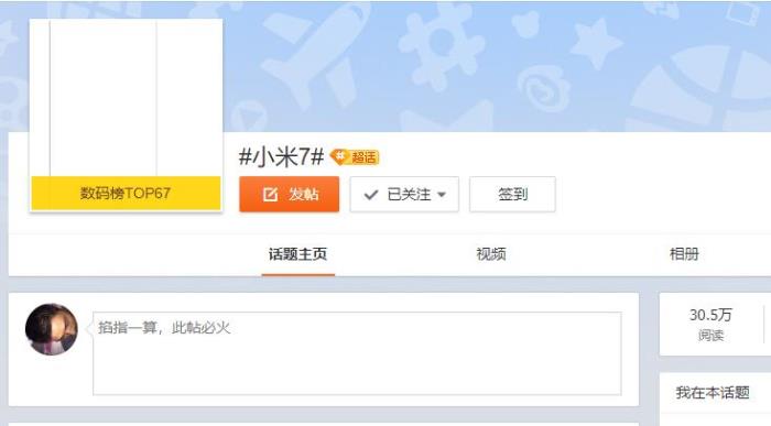 ↑ 除了苹果外,靠着超高性价比和发烧配置的小米粉丝也不比苹果逊色,这不明年的小米7除了骁龙845和全面屏外还没任何确切消息,微博上小米7的话题就已经升为超级话题,不仅数码榜排行TOP67,阅读数已达到了30万!要知道按照小米6的发布日期,小米7还有近半年才能发布!