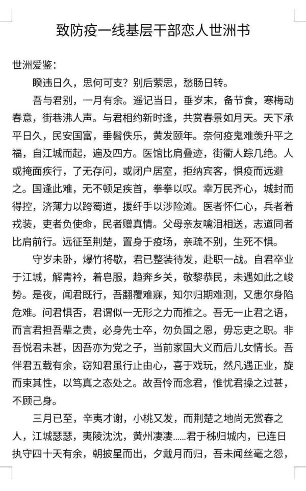 近日,身在宜昌秭归的女生向卉,为男朋友写下千字文言情书,激励身在宜昌秭归的男友奋力战疫,动人的文字吸引了亲友关注,纷纷转发分享。