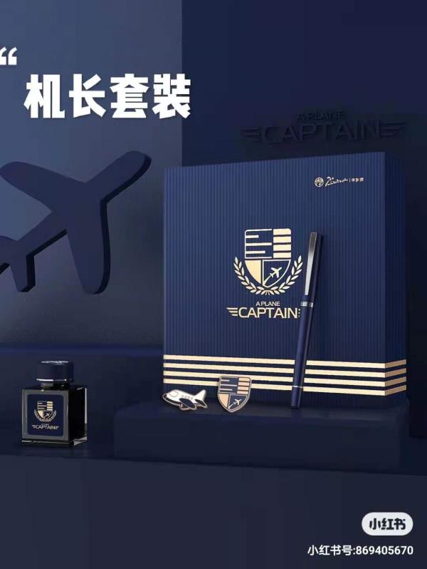 笔身线条凌厉,象征着新时代机长锐意进取的形象,四道精致银环,机长源自机长四道臂章,分别代表专业、知识、技术、责任。礼盒还搭配了两款精致的徽章,让他成为人群里最帅气的仔!