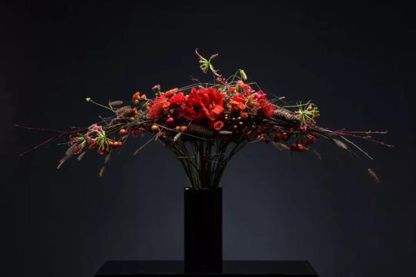 主要花材:朱顶红、针垫花、嘉兰、蔷薇果、日本海棠