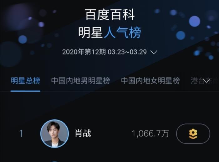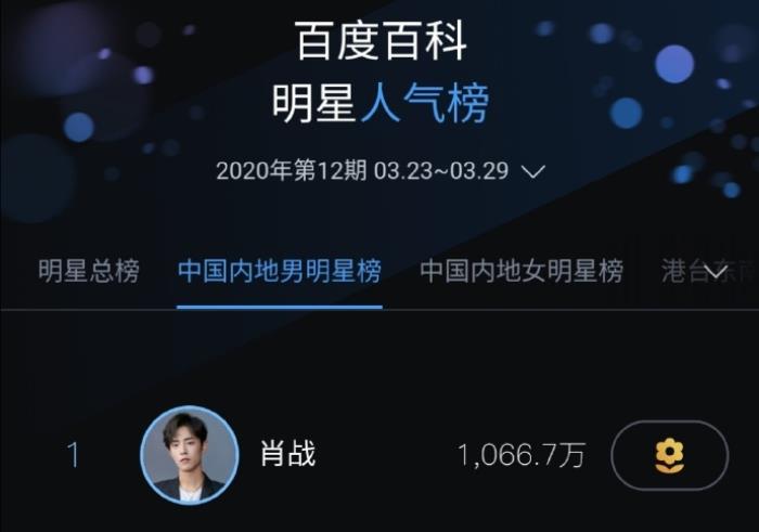 肖战登顶百科明星人气榜新一期周榜“内地男明星榜”和“明星总榜”双榜TOP1!同时占据V榜艺人新媒体电视剧演员第二!多个榜单持续登顶!用数据证明的超高人气与实力,期待《余生请多指教》《斗罗大陆》。