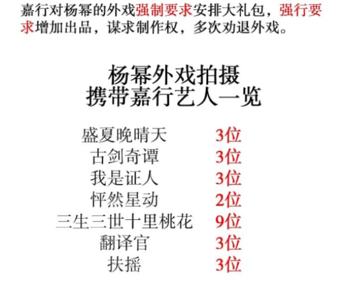 粉丝认为,经纪公司完全没有为杨幂的事业做出长远的规划,一味地把杨幂当成赚钱的工具,而且多次劝阻杨幂接拍外戏。但凡接拍外戏,嘉行必安排“大礼包”:增加出品制作权,安插公司的新人等等。这也导致了杨幂在业内的口碑不好,丢失了很多资源和机会。于是,粉丝开撕嘉行,线上抵制不行,就线下抵制。