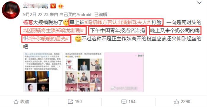 而且,这几天有杨幂粉丝大规模地脱粉,他们表示对嘉行很失望,对杨幂没有事业上进心很失望。还有多年的大粉疑似脱粉后回踩,指责杨幂只知道玩游戏,不认真拍戏!