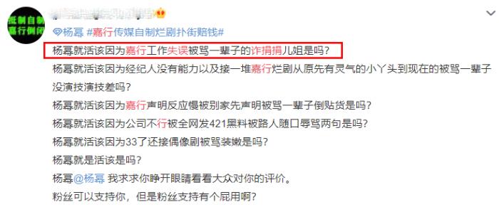 接着,杨幂“诈捐事件”又因为中国青年报的一条微博被重新提起,惹怒了众粉丝。当时,中国青年报发博称“诈捐将不能参评中华慈善奖”,配图为当初杨幂诈捐的新闻报道。这一举动再度将杨幂推上舆论的风口浪尖。这下粉丝更生气了,因为他们认为当初就是由于嘉行的失误才让杨幂被外界冠上了“捐姐”的黑称。