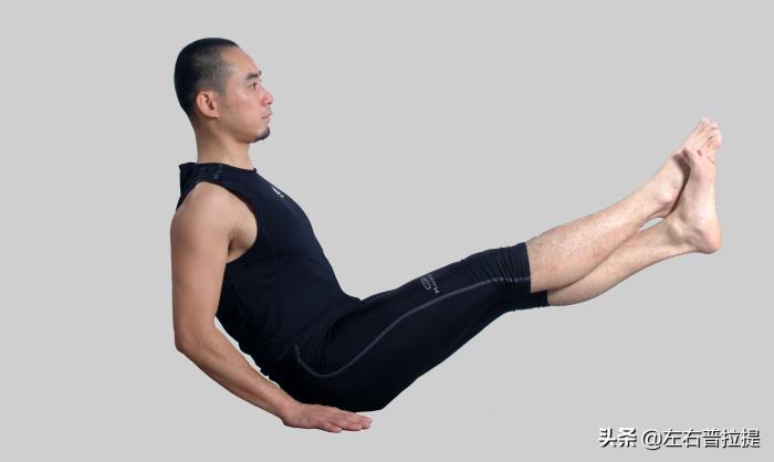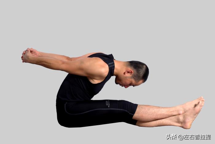 呼气,保持腿交叉,流畅地往上卷起到“V”形悬体的姿势,两手臂与地面平行,伸向脚的方向,保持平衡。