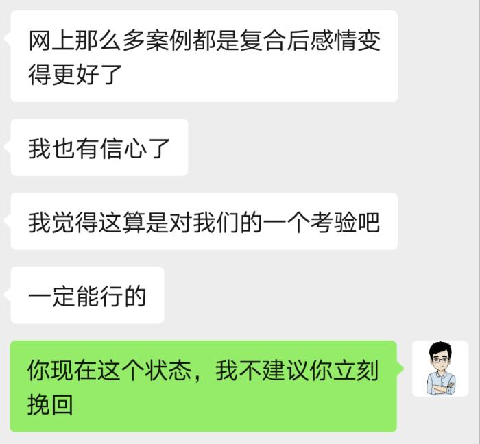 道理很简单,挽回的信心不应该从别人的成功案例那里去获取。从别人那里获取的信心,会使你先入为主地进入"片面看待"的模式。