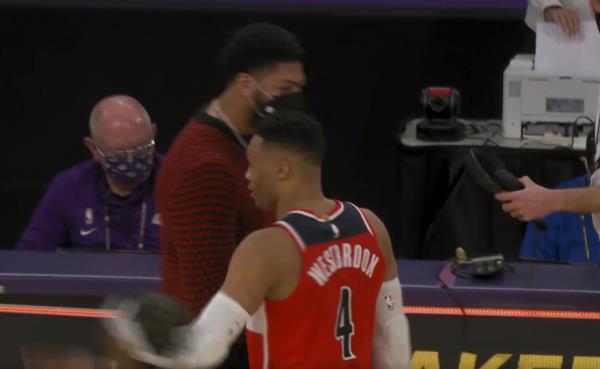 奇才战胜湖人之后,威少主动走到技术台附近,想与浓眉哥寒暄两句。一般NBA比赛结束后,双方球员都会来到场边交流沟通,算是一种比较常见的操作了。