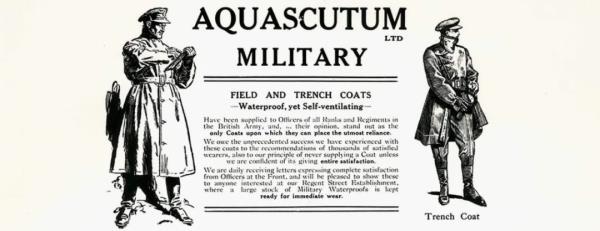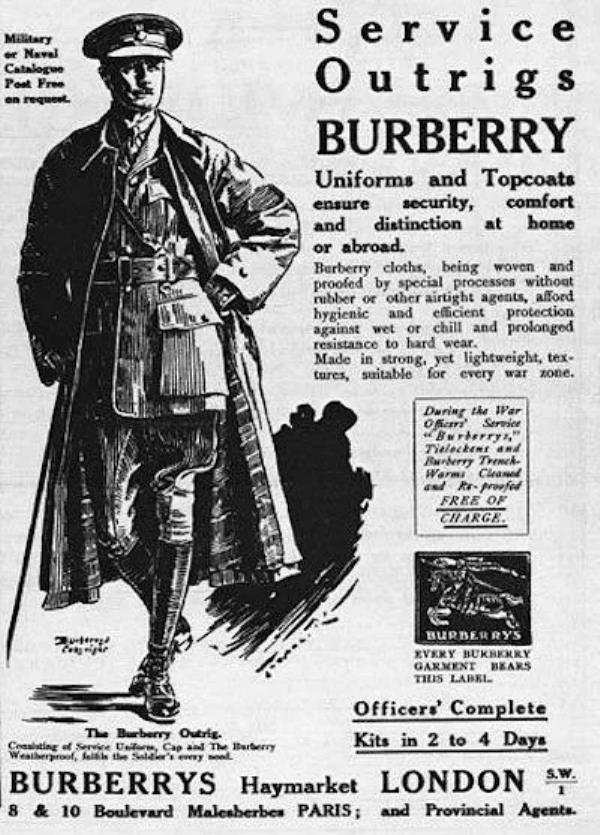 一战期间,英军希望找到一件能支持士兵在潮湿的壕沟里穿着,防风雨、有隐蔽性以及多功能的衣服。伦敦两家裁缝店接到了订单。