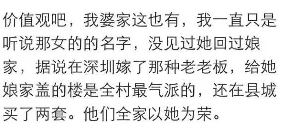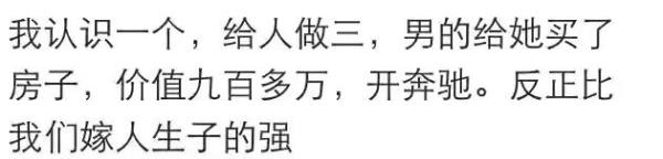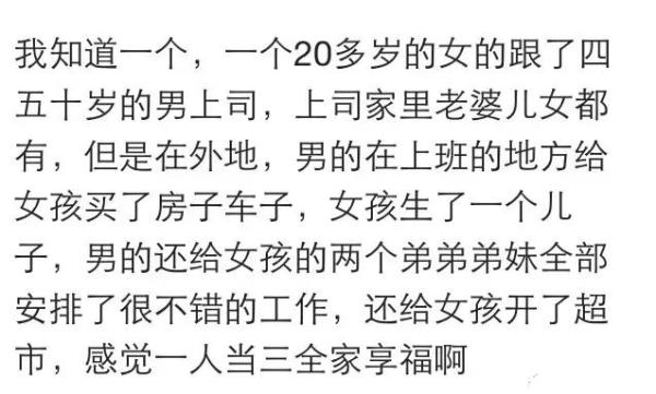 网友:我三个同学,第一个小学同学,初中都没上过,去北京打工,认识了一个有钱男的,给人当小三,日子过的挺潇洒,在村里给爸妈哥哥盖了房子,隔三差五给家人买礼物,娘家人都靠她养活,她妈让她赶紧生个孩子好把男的捆住,结果男的不让生,跟了男人好几年,被甩了,换了个地方,又找了一有钱人,这回生了个儿子,算是稳定了。第二个是我初中同学,长得超级好看,当初那男的追她的时候她才19岁,给她开了个手机店,后来她成年了,男的跟原配离婚,去她家提亲,她爸妈不同意,男的当场把88万的彩礼甩出来了,她爸妈啥也没说,同意了,据说那男的跟她爸就差了一岁,婚后给她爸妈哥哥都在城里买了房,还给她哥哥安排了工作,村里的房子也翻新了。婚后生了个儿子,她妈帮着带,一个月给她妈一万块钱的工资,后来孩子六七岁的时候,离婚了,带着一套三居室,一辆车,存款若干,走了,孩子留给了男方。第三个同学也是初中同学,跟第二个是发小,做小三的时候被原配追着打,后来不得已,离开了那个城市,男的来我家这边给她买了车房,每月都来她这住几天,原配带人过来打她,可到了自己地头,原配拿她没办法,过了几年,生了个儿子,男的离婚,把她扶正了。