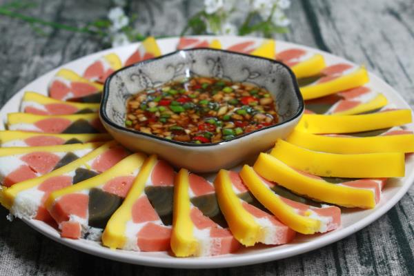1、火腿肠一分为四,鸡蛋清蛋黄分离,皮蛋去壳一分为四。