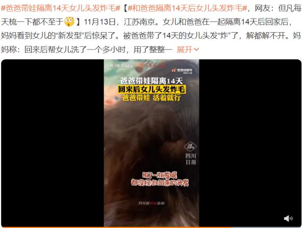 别的不说,前几天看微博,一个爸爸单独带女儿隔离。14天出来以后,娃满脑袋头发都打结了。妈妈用了1整瓶润发乳,花了1个小时都没拯救过来。