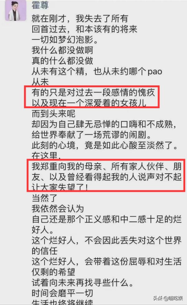 在霍尊的各种综艺解约之后,疑似霍尊的朋友圈曝光,疑似对自己现状的坦白。不过从文字来看,陈露可能要失望了,因为霍尊还是并未提到陈露,也没有对陈露说一句抱歉,反而霍尊是对自己的妈妈道歉。并且还喊冤枉,霍尊连续说了两遍,自己什么也没做,真的没做,说自己其实就是口嗨和不成熟,什么事情也没做过。而且对于和陈露的感情,霍尊就说了是愧疚,但并未提到陈露。反而是大方地承认自己现在爱着一个女孩儿。但不是陈露。
