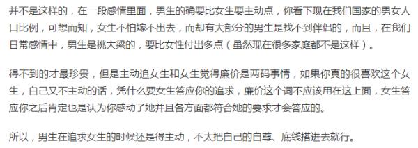 这个是不对的,男生追女生是很多地方的常态,不能说追求一个人就觉得廉价,爱一个人是神圣伟大的,追一个人又是需要莫大的勇气的,既然喜欢一个人,难道还会等着别人来跟你在一起来追你嘛,肯定是需要你主动去追求别人的呀,这怎么能算作是廉价呢,女生只会很开心很感动,她有人喜欢有人爱,有人会对她好追求她,再去好好的努力一把,两个人就在一起了,哪里来的廉价不廉价,追求人难是真的,女生太容易答应了只会让自己变的很廉价,就不会让人感到来之不易的爱情,要好好的珍惜你,男追女隔座山女追男隔层纱,这句话是没错的。所以,喜欢一个人就大胆的去追求吧,机会总是要自己去争取的,能不能在一起没关系,爱过,就好。毕竟,我也追过别人半年没结果哈哈哈