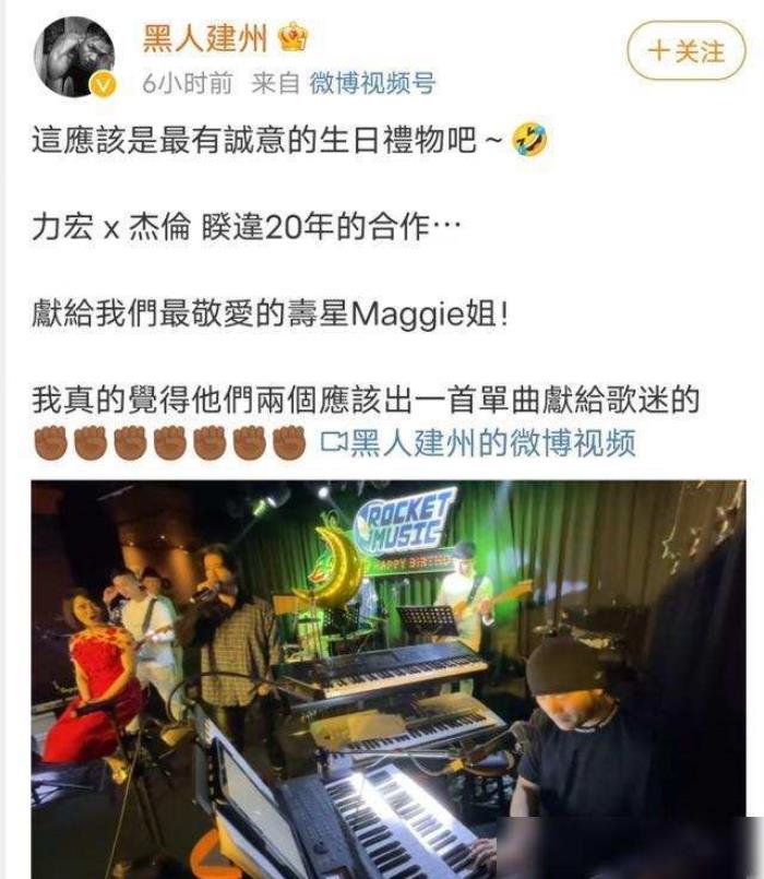 这次为给Maggie姐庆生,陈建州感叹,”这应该是最有诚意的生日礼物吧。”视频中,王力宏留着中长发和络腮胡,周杰伦在旁边为他伴奏。