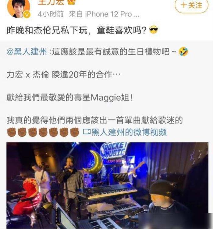 陈建州听完王力宏和周杰伦的表演后,感慨说,”久违20年的合作,我真的觉得他俩应该出一首单曲给歌迷。”王力宏转发说,“昨晚和杰伦兄私下玩,‘童鞋’喜欢吗?”