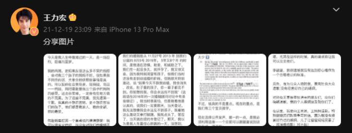 李靓蕾发长文锤王力宏后,后者被封“聋的传人”,直到12月19日才发文回应。他在当日晚上发布四张图片回应,一言以蔽之就是“我没有对我们的婚姻不忠”。