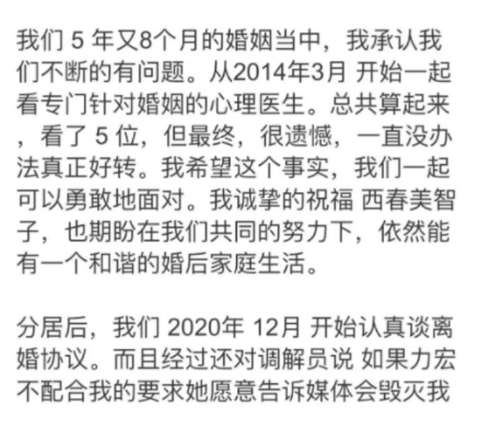 文末,王力宏表态会一一回应李靓蕾的5000字指控,而那一句“我的文笔没有靓蕾好”颇有阴阳怪气的感觉,他一直称呼对方是西春美智子,点明其中日混血的身份,企图将矛头转移,茶味儿浓郁。