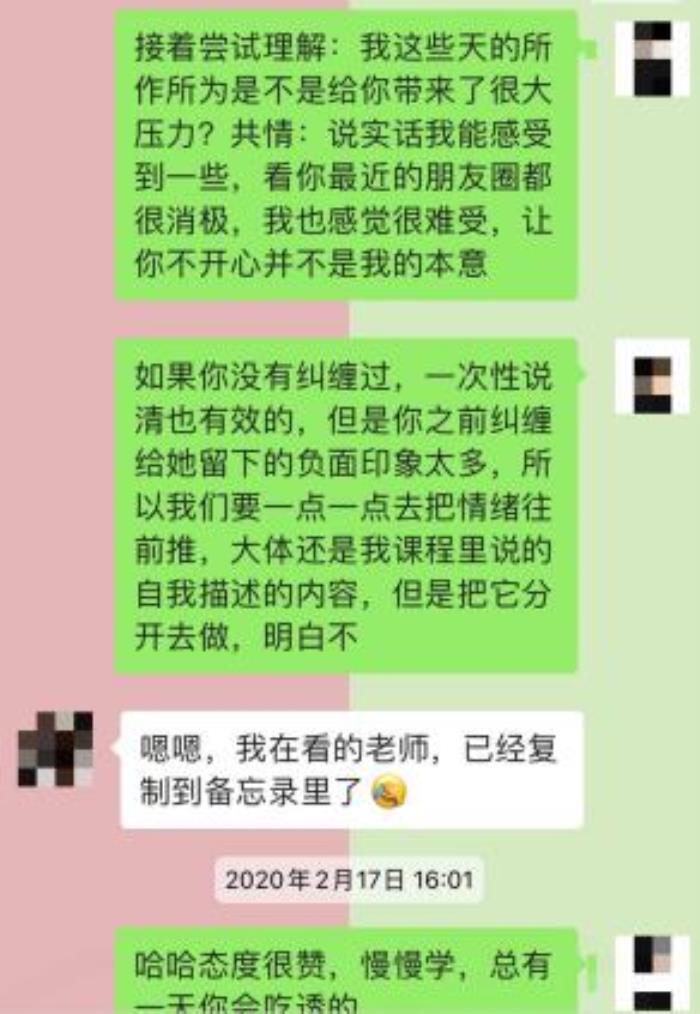 事实上,木木在杨光尝试理解她的阶段就已经给了反馈,但每个人的表达能力和性格特点都不同,如果你发现"诶我怎么发了两星期了她还是不回我?",那你就应该返回第一步,好好揣摩一下她的个性,再来反思一下;