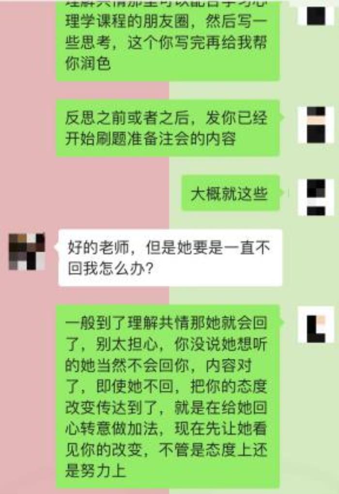 就像我帮杨光开始挽回的时候,他已经纠缠了半个月,每天说的就是道歉表白之类的,但是从来得不到回复。
