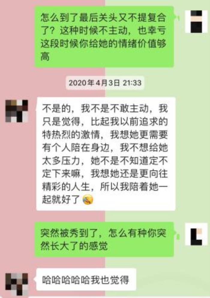 到了四月份的时候,疫情已经得到了很大控制,他们约着见了一面,这一次,杨光用成熟理智的态度,复盘了这段时间的心路历程,木木也坦诚,提分手的那段时间确实也是压力太大了,两人谁都没有说复合,只是默默把手牵在了一起。