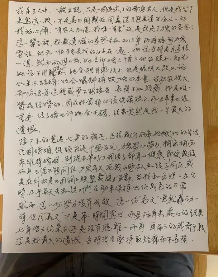 王大中信中称这些年与儿子的婚姻可以用痛苦以及地狱般的生活来形容,一直给李靓蕾泼脏水。但万万没想到,王大中替儿子辩解的这封手写信,竟然侧面实锤了王力宏婚内的一些行为,譬如王力宏确实让李靓蕾未婚先育,以及婚姻最后两年双方分居,王力宏不给李靓蕾和孩子住处。