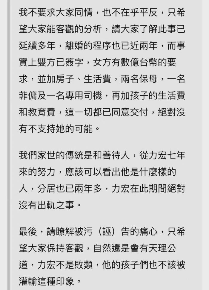 不过,通过王力宏父亲的信,也可以跟李靓蕾的发文对上一点:从结婚开始,王力宏一家就从没把李靓蕾当过一家人看待,在他们眼里李靓蕾就是一个心机满满的外人,这场婚姻他们只想到过孙子和自己儿子的未来。
