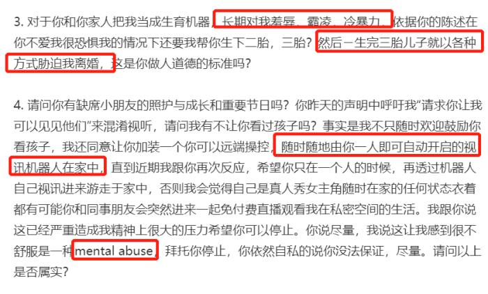 在李靓蕾的长文中,她表示王力宏除了感情上的不忠诚之外,其实最为夸张的地方在于他对自己的长期羞辱和冷暴力,甚至达到了精神虐待的程度。据说王力宏还曾在家安置一台机器人,以便自己随时可以在外观看家中情况。李靓蕾觉得这种毫无隐私的生活,是她无法接受的。