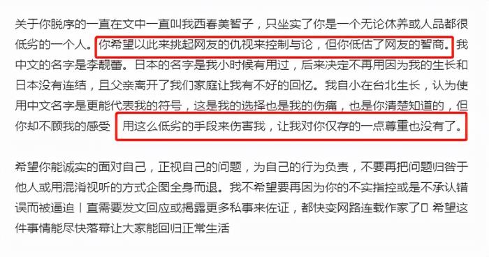 最后,王力宏在回应文中曝光李靓蕾真实名字,无非是想利用网友的仇视心理来攻击李靓蕾。