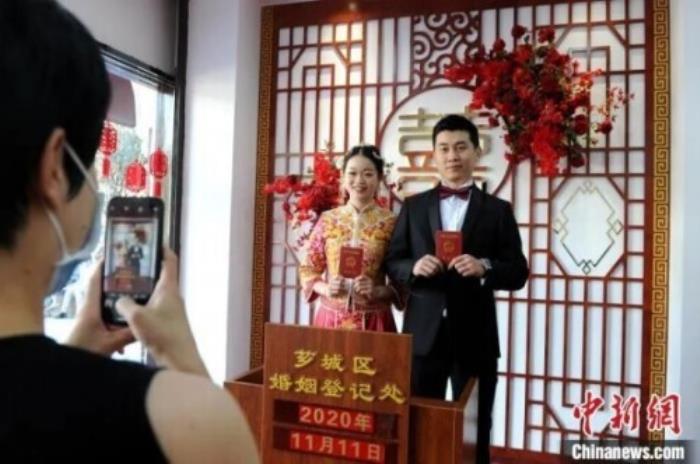 2020年11月11日,新人们领取结婚证书。张金川 摄