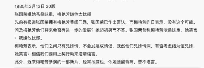 甚至梅艳芳曾对张国荣说过,要是到四十岁我没结婚,那你娶我吧,张国荣说好呀。