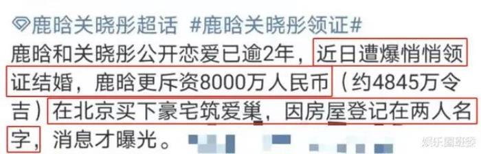 此前,网上有报道这样说的,关晓彤怀孕,已经与鹿晗秘密结婚。鹿晗斥资8000万元在北京买下两人的爱巢。这所房子以鹿晗和关晓彤的名义注册。