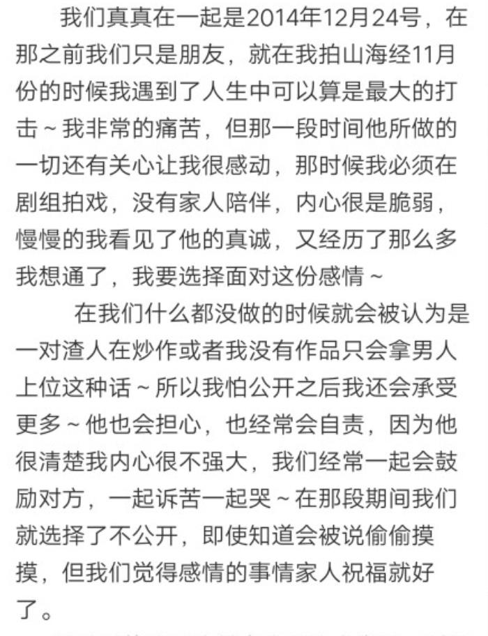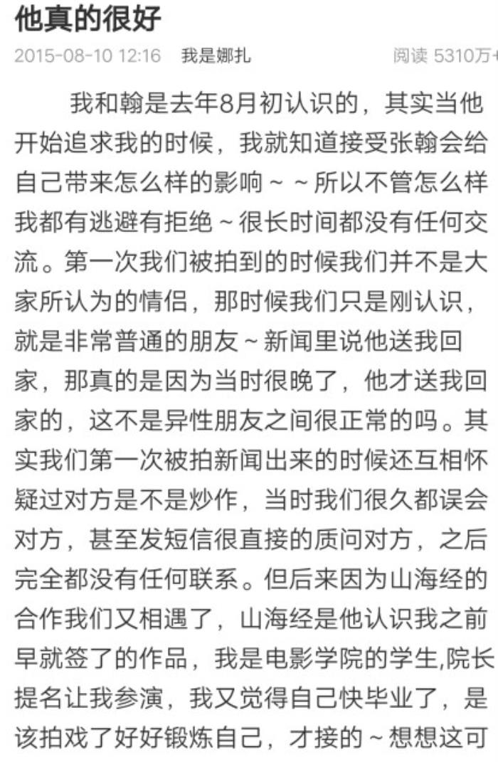 自2015年8月,张翰在微博公开宣布与古力娜扎的恋情,但这一对恋人,从在一起的一开始就受到各种“伤害”。还记得在张翰公布恋情之后,网络上铺天盖地的流言向他们纷纷涌来。那年8月,古力娜扎发了一条长长的文字,讲述了两人相知相恋的过程,并表示他们真真是在2014年12月24日在一起的。并取名为:他真的很好。
