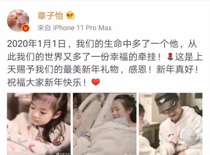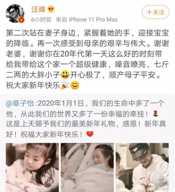 “2020年1月1日,我们的生命中多了一个他,从此我们的世界又多了一份幸福的牵挂!这是上天赐予我们的最美的新年礼物,感恩,新年真好!”以上这段话是章子怡在2020年1月3日分享在个人网页上的内容,根据文字中的信息和章子怡配的图片,我们很容易得知,章子怡的二胎宝宝出生了。随后汪峰转发了章子怡文章中的内容,并补充到“谢谢老婆带给我们家一个超级健康,嗓音嘹亮,七斤二两的大胖小子,开心极了,顺产母子平安。”