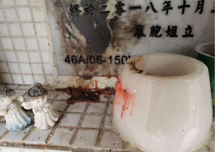 拉近点距离,可以很清晰的看到,墓碑被烧黑了一大片,且墓碑上字也被黑污覆盖了,但并没有全部覆盖。旁边的盛放鲜花的白色容器被烧黑了,且表面有红色的蜡烛。