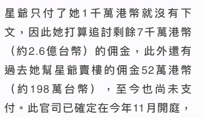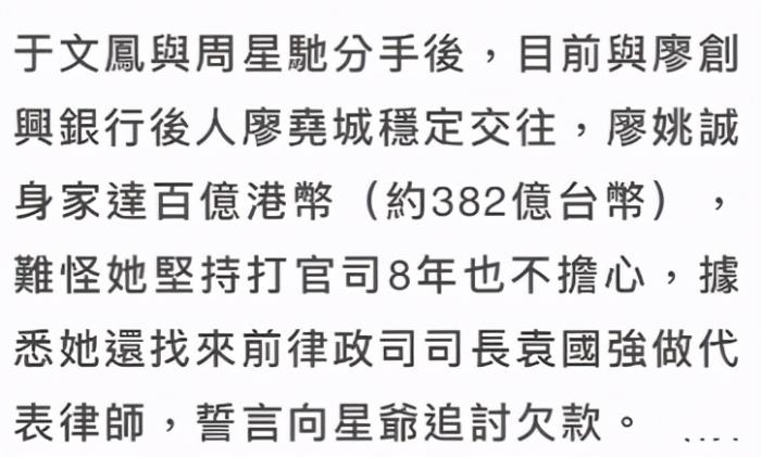 据港媒11月19日报道,周星驰的旧爱于文凤罕见露面,亲自向周星驰追讨7000万港币(约6000万人民币)的佣金。